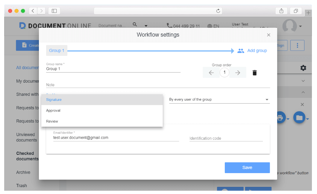 Control approval workflow and e-signature workflow processes together with Document.Online.