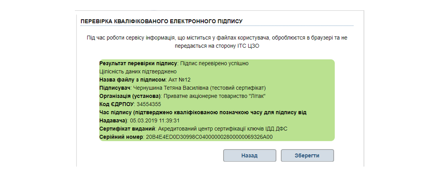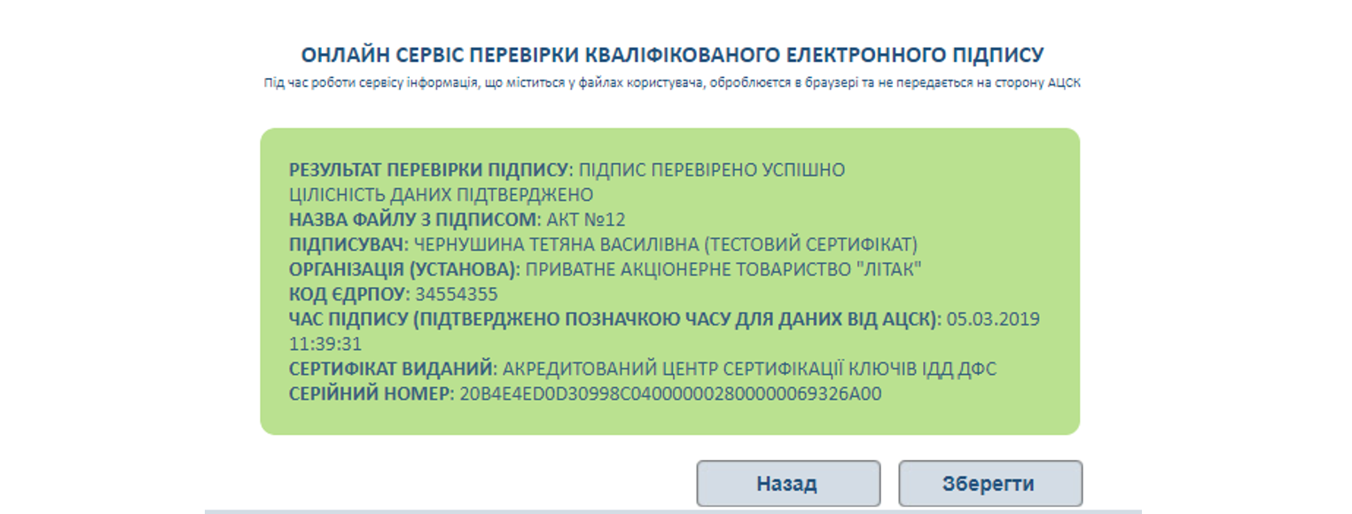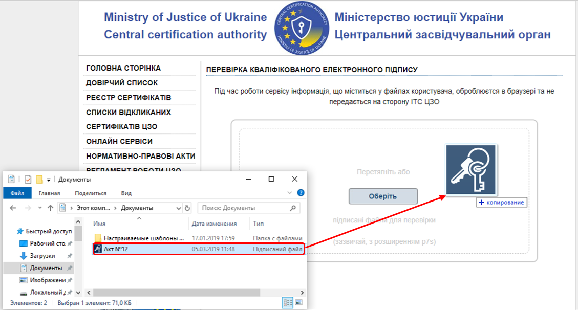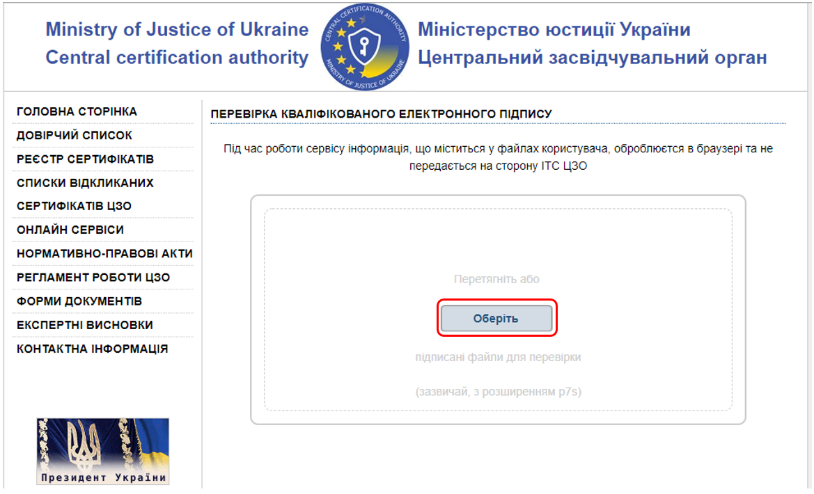 Натисніть кнопку «Оберіть» та вкажіть місцерозташування документа на комп’ютері або просто перетягніть необхідний документ. Після цього Ви побачите результат перевірки КЕП.